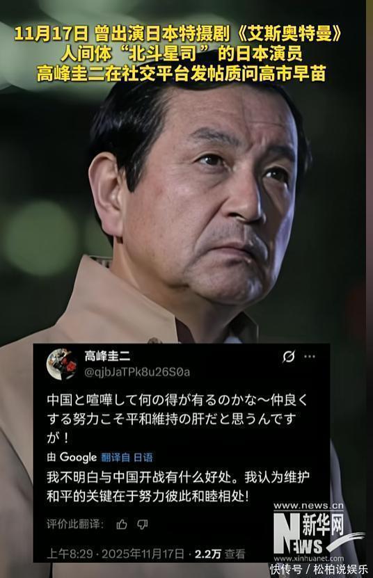 而另一位资深演员高峰圭二,则在X平台上直截了当地回应高市早苗的言论。这位在日本颇有分量的老戏骨表示:中日之间隔着一条水,但绝不是隔着一道仇恨;任何挑衅都会让双方受损,坚持一个中国、搞好双边关系,才是维护和平的唯一方式。三人接连发声,在短时间内就在全网引爆了讨论。